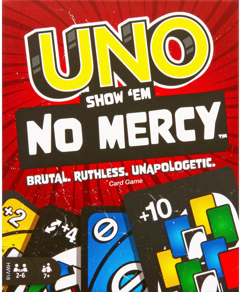 UNO Show 'Em No Mercy is a brutal, ruthless version of the classic UNO card game. In addition to standard action cards like Skip, Reverse, and Draw 2, No Mercy comes with Wild Draw 6, Wild Draw 10, Skip Everyone, Discard All, and the new Wild Color Roulette - a card that forces the next player to choose a color and then draw until they get a card of that color.