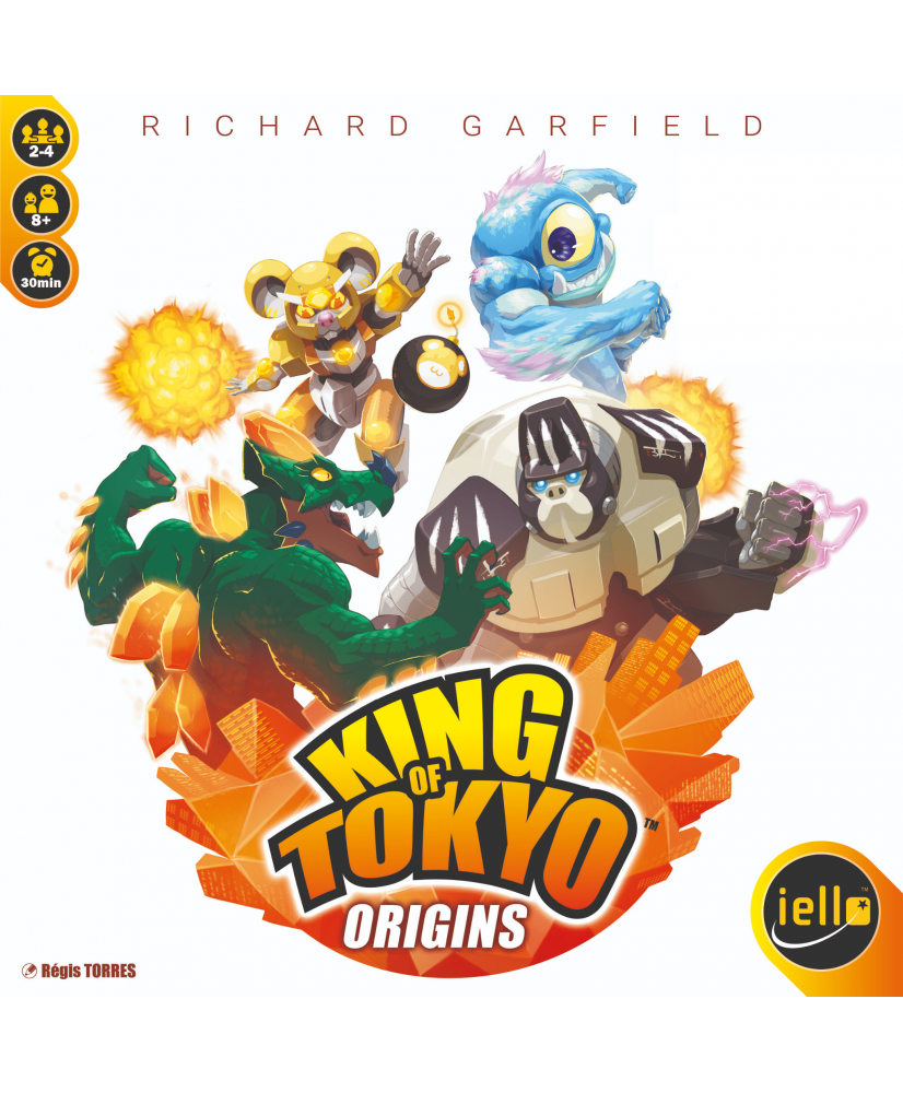 King of Tokyo: Origins is a standalone game in the King of Tokyo series that's meant to serve as an entry point for new players since it's a smaller, more affordable package. The game includes four new monsters, an assortment of new power cards mixed with older ones, energy cubes, and green dice with yellow characters.