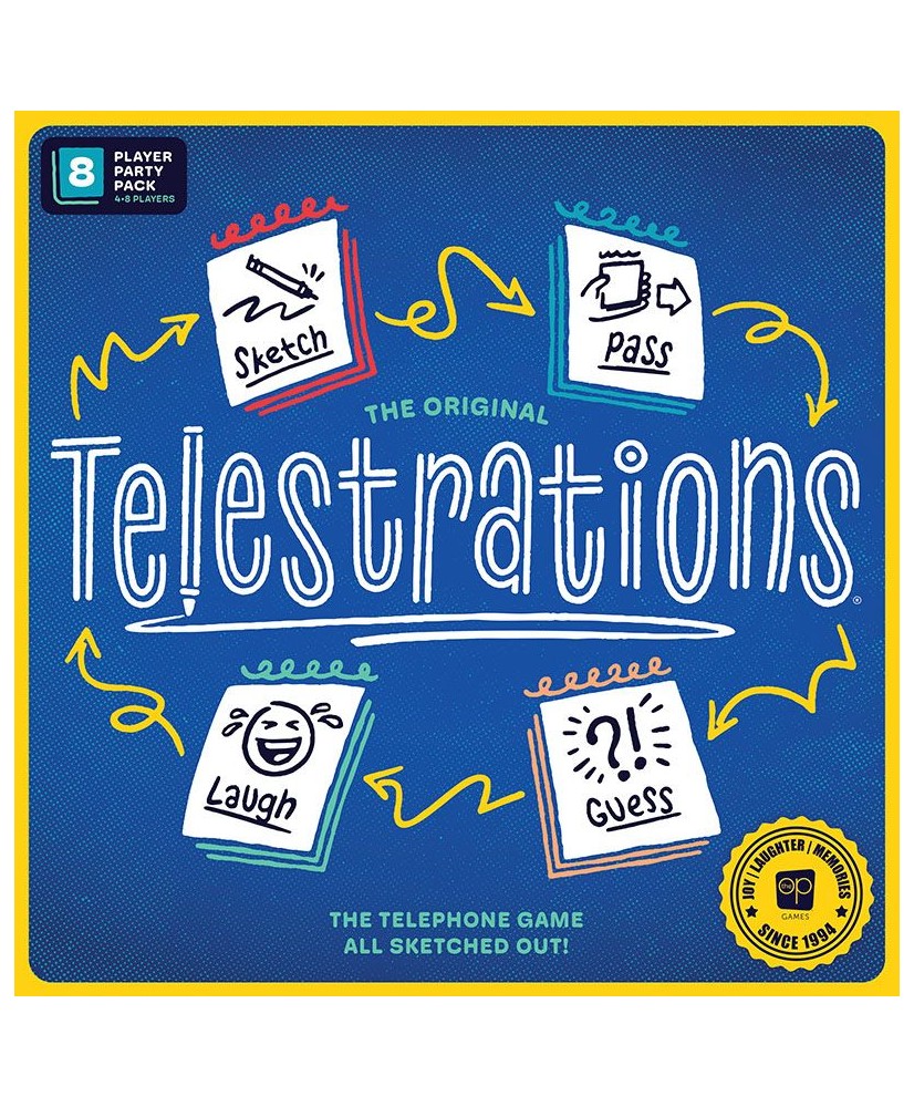 "Each player begins by sketching a TELESTRATIONS word dictated by the roll of a die. The old fashioned sand timer may limit the amount of time they get to execute their sketch, but it certainly doesn't limit creativity! Time's up! All players, all at the same time, pass their sketch to the next player, who must guess what's been drawn. Players then simultaneously pass their guess -- which hopefully matches the original word (or does it??) -- to the next player who must try to draw the word they see -- and so on." "Telestrations contains eight erasable sketchbooks and markers, a die, a 90 second sand-timer and 2,400 words to choose from." Inspired from the public domain game, Eat Poop You Cat AWARDS & HONORS 2015 Vuoden Peli Party Game of the Year Winner 2013 Kinderspielexperten "8-to-13-year-olds" Second Place 2013 Kinderspielexperten "8-to-13-year-olds" Nominee 2012 Årets Spill Best Party Game Winner 2011 Games Magazine Best New Party Game Winner 2010 Origins Awards Best Family, Party or Children's Game Nominee 2010 Golden Geek Best Party Board Game Winner 2010 Golden Geek Best Party Board Game Nominee