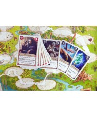 The movement of the characters is controlled by a special dice mechanism. Colored dice determine which figure can be moved. Your dice value determines the number of spaces a figure can travel. By choosing the dice before and after the roll, players are faced with decisions that are seemingly uncomplicated, but nevertheless significant for the outcome of the game. Black dice, which always must be rolled, trigger threats or cause encounters with enemies or friends. The encounter cards ensure the continuous, ever-growing threat to completing the quest.