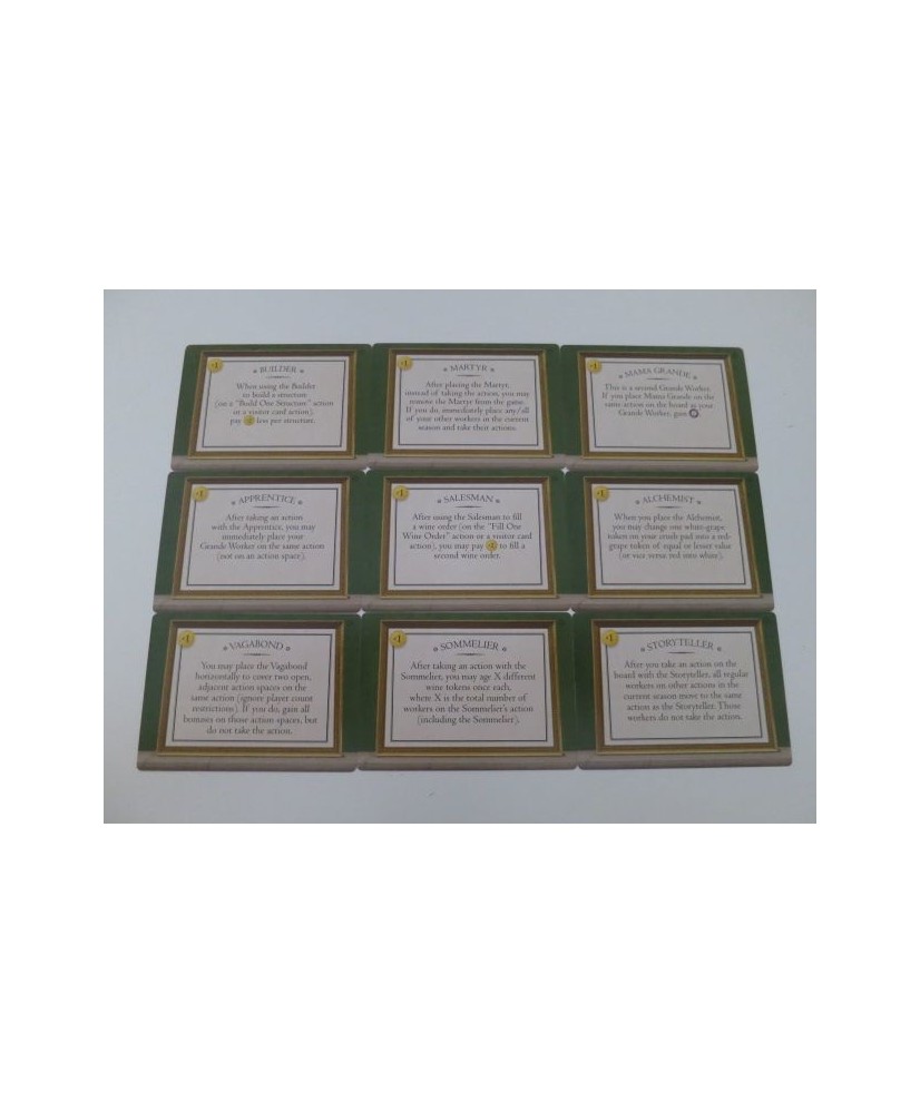 These 9 special worker promo cards, designed by Jamey Stegmaier and Dave Armstrong, can be added seamlessly to any copy of Tuscany or Tuscany Essential to add to the variety of the special worker expansion. The new cards are Builder, Apprentice, Vagabond, Martyr, Salesman, Sommelier, Mama Grande, Alchemist, and Storyteller.