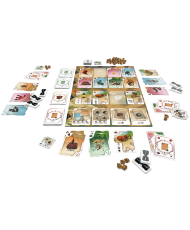 Cards are placed on the board. Each turn, players use pairs of dominoes to create coordinates and grab the corresponding card on the board. Among this grid of cards: fantastic creatures divided according to their species and biotopes, scientific objectives but also various equipment cards to facilitate the taking of future cards. After 7 rounds, the player that has successfully completed their objectives and collected the greatest creatures wins the game.