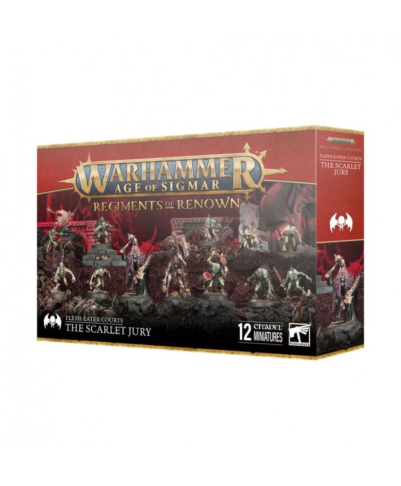 This boxed set builds The Scarlet Jury – a Regiment of Renown for your Cities of Sigmar, Kharadron Overlords, Slaves to Darkness, Nighthaunt, Ossiarch Bonereapers, Soulblight Gravelords, Ironjawz, Kruleboyz, Ogor Mawtribes, or Sons of Behemat armies in games of Warhammer Age of Sigmar. It's also a great way to start a new Flesh-eater Courts collection – or expand an existing army – and save money compared to buying the kits individually. They are led by the Grand Justice Gormayne, a deluded magistrate of Ushoran's court, and a Royal Decapitator who carries out his sentences. The 'jury' is formed from a unit of Cryptguard – elite warriors eager to execute their lord's will without question.