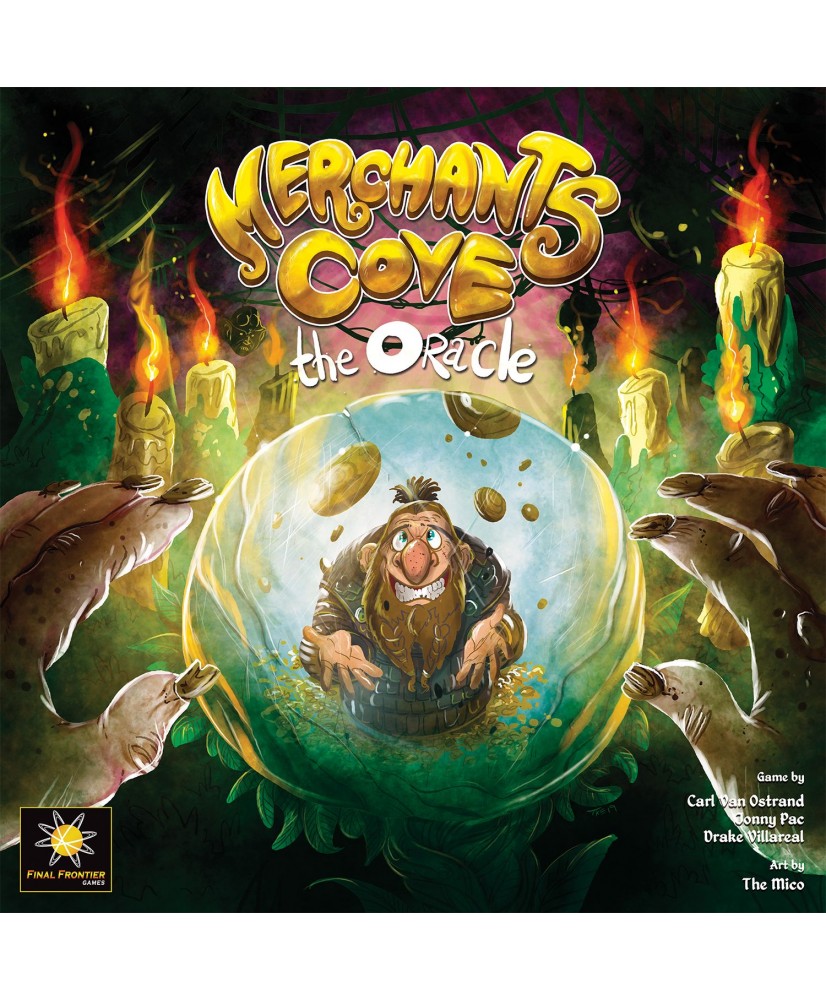 The Oracle is a new merchant you can play as. It is centered around a roll & write style game, with a pen, dry-erase board, and custom dice tray. Each turn you throw a handful of runes (a coin, bone, voodoo meeple, and dice) into a divided dish, then you record the results on your board in various ways to perform actions—and predict the future!