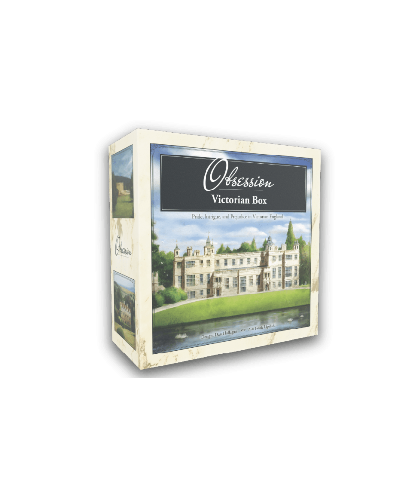 The Victorian Box is designed to hold all Obsession content, including the major expansions Upstairs, Downstairs, Characters, and Wessex. It has 50% more volume and is draped with original artwork on all panels. It also holds promotional content, most insert brands, playmat, universal rules compendium, sleeved cards and tiles, upgraded coins, and custom meeples. The new nesting boxes keep components snug even when stored on its side.