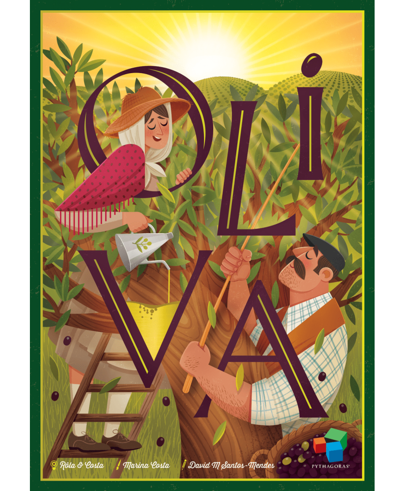 Oliva depicts both traditional and modernizing production methods, highlighting the productivity of small olive groves that may still be admired today on Portugal's hillsides. The game reflects Mediterranean olive oil production's scope and quality, as Spain nears Italy's production levels, followed closely by Greece and Turkey.