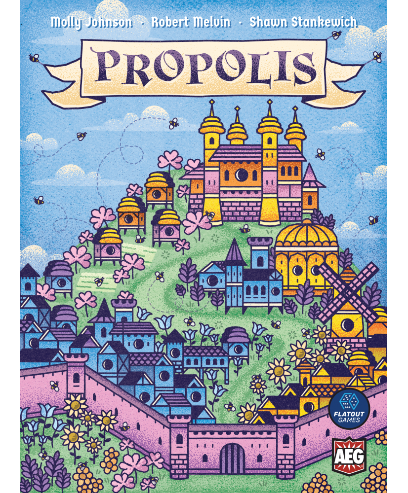 Propolis is a worker-placement, engine-building, area-control, and tableau-building game. Players take on the role of competing medieval bee colonies and take turns deploying worker bees to collect pollen, fortify their positions, and construct their hives to appease their queen and become the most glorious in the land!