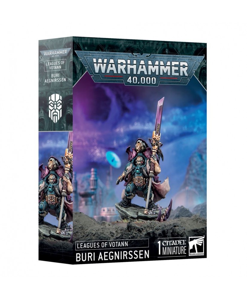 This multipart plastic kit builds Buri Aegnirssen, a ferocious leader for your Leagues of Votann armies in games of Warhammer 40,000. This savage soldier has seen countless battles and endured injuries that would have laid most Kin low. He wields a custom darkstar glaive and an Autoch-pattern bolt pistol sidearm with expert skill. Buri is the ideal commander for an aggressive force as he likes to get to grips with his foes, no matter who or what they are.