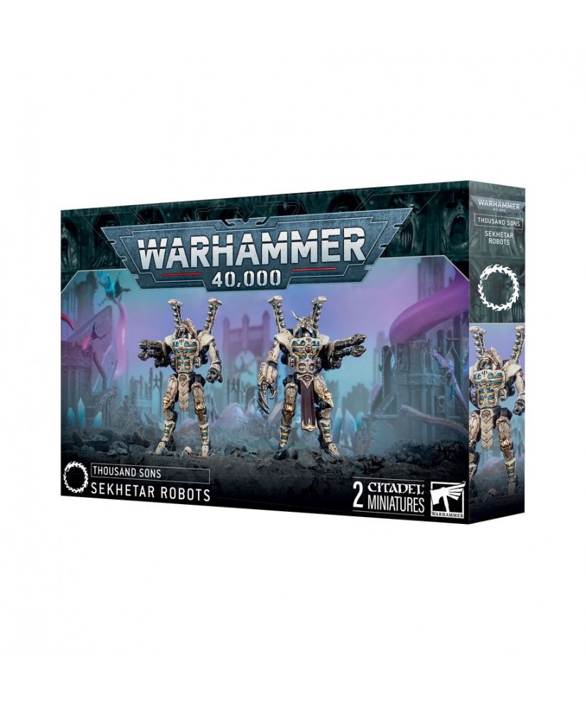 This multipart plastic kit builds two Sekhetar Robots, powerful battle automata for your Thousand Sons armies in games of Warhammer 40,000. These looming mechanical constructs are equipped with heavy warpflamers and hellfyre missile racks. They are also both armed with a pyreflux meltagun, which can optionally be replaced with a warpflame projector and power claw. They are ideal for guarding key objectives, easily keeping enemy warriors away with their lethal firepower.