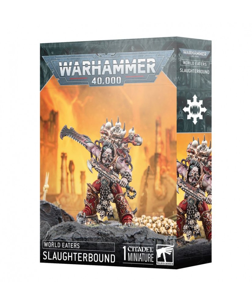 This multipart plastic kit builds one Slaughterbound, a mighty daemon-possessed warrior for your World Eaters armies in games of Warhammer 40,000. This savage leader offers a bloodthirsty way to add even more hitting power to your charge, and inspires nearby warriors to even greater acts of skull-taking. He can be assembled with one of two different heads, and with or without an icon of Khorne rising over his head, offering a degree of customisation to your Bloodthirster-possessed brute.