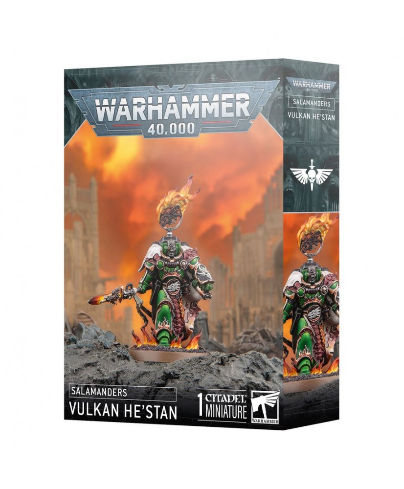 Vulkan He'stan, the Forgefather of the Salamanders, strides into battle with the weapons of his Primarch in his hands. As the seeker of the lost relics of Vulkan, he is relentless in his quest, willing to fight through any foe and face down any danger to see his oaths fulfilled.