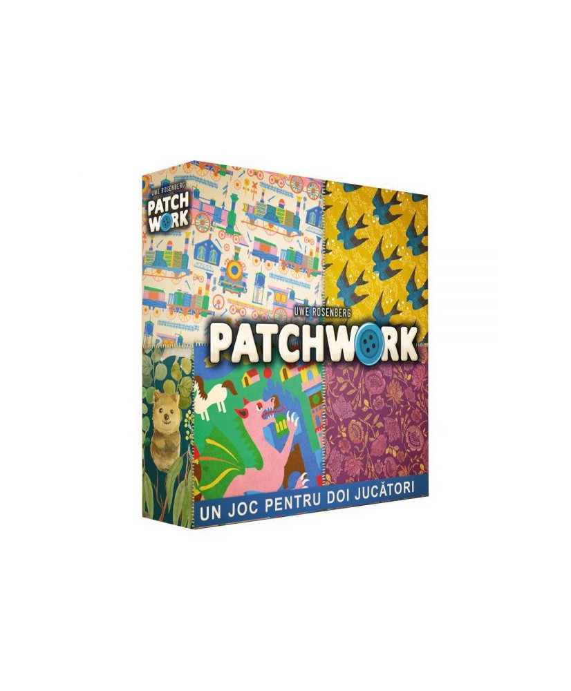 In Patchwork, two players compete to build the most aesthetic (and high-scoring) patchwork quilt on a personal 9x9 game board. To start play, lay out all of the patches at random in a circle and place a marker directly clockwise of the 2-1 patch. Each player takes five buttons — the currency/points in the game — and someone is chosen as the start player.