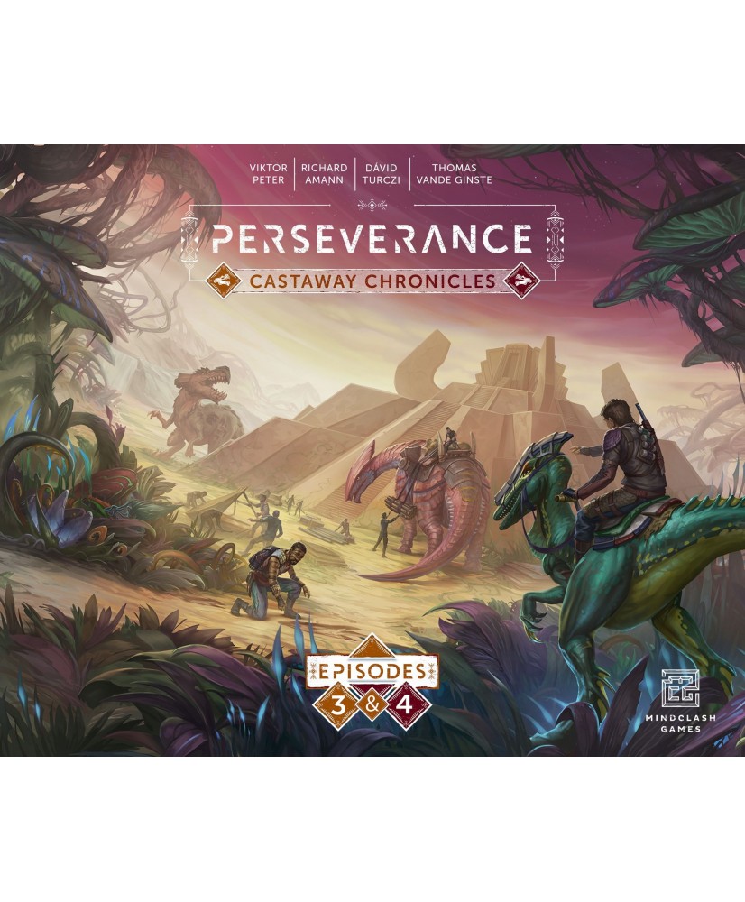 Perseverance: Castaway Chronicles - Episodes 3 and 4 are two medium-heavy, thematic Euro games, concluding the story of time-lost survivors on a dinosaur island. Each Episode is playable as a standalone game, or in the Chronicle mode that ties four games - one with each Episode - into a continuous story. As the hallmark of the Perseverance series, each Episode features many unique characteristics and a very distinct game feel, but their core mechanisms and concepts are similar, making each new Episode much easier to learn.