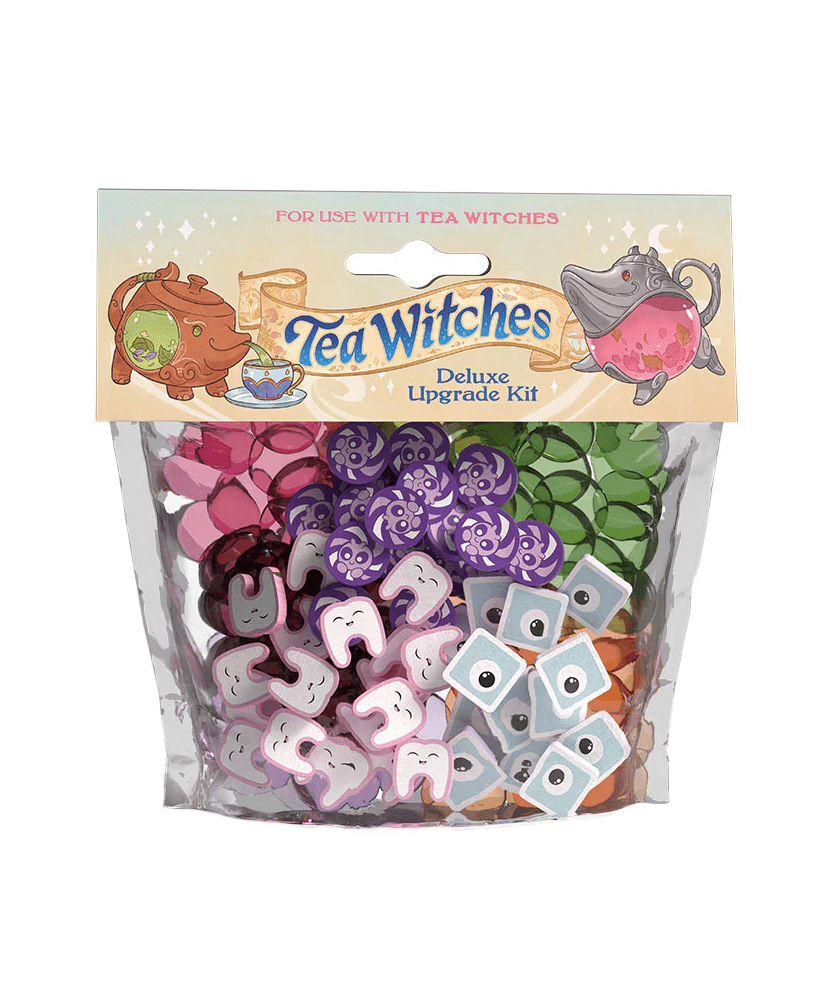 Enhance your Tea Witches experience with the Deluxe Upgrade Kit including 75 wood pieces representing the Sweet Tooth, Eye Cube and Boba Bug Toppings along with 108 beautiful acrylic beads representing the Tea Tokens.