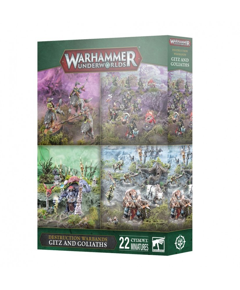 This kit collects four Destruction-themed warbands for Warhammer Underworlds. All the miniatures are push-fit, moulded in coloured plastic, and include scenic bases on the frames so you can start playing quickly. You'll also find warscroll cards and fighter cards for each warband. Hrothgorn's Mantrappers are a versatile Flex warband, Rippa's Snarlfangs are an aggressive Strike warband, Zarbag's Gitz are an ambitious Take and Hold warband, and Mollog's Mob feature the Mastery playstyle, which rewards players for careful management.
